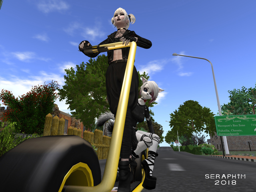 The other day, Seraphim saw a review on the indefatigable Inara Pey’s blog, for the SG33E RoadRunner… the moment she saw it, she saw herself and her baby on it… so, the first thing she did after her baby logged on, this morning, was take her for a spin around their neighbourhood… Zoey Zoe Zoe loved it!…