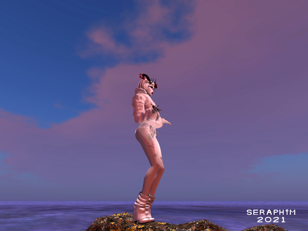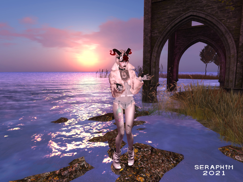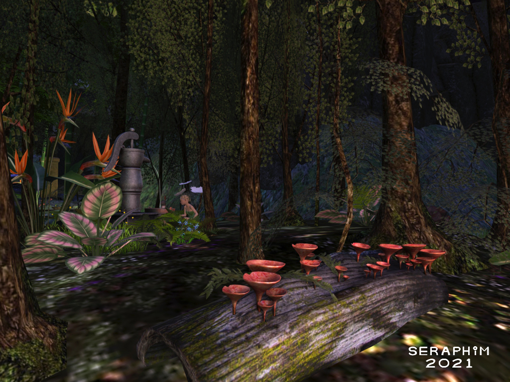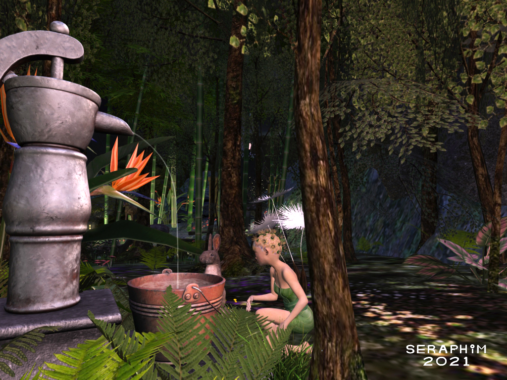 … and sit here, endlessly entranced by the water running into the bucket from the fountain. The bucket is plumbed back to the fountain, so it never fills up, but is always filling. Perhaps the Fae and her friend don’t know this, and think the bucket is a magical thing?…