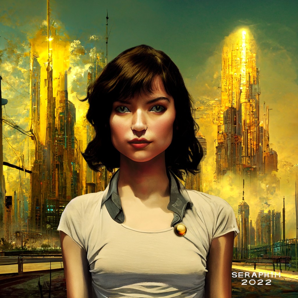 I recently started a series of images I am calling the ‘Golden Planet’ series. I have been posting them on my Flickr page. There has been ‘Golden Planet Princess’, and ‘Golden Planet Pilot’. Over the last few days, I created ‘Golden Planet Tourist’. I make these works using multiple images I create in wonderful Midjourney, then I take several of those images into gorgeous Photoshop, and stitch them together with a fair bit of masking, and some touchup painting and a bit of clone stamp magic. I’d almost finished ‘Tourist’, when I decided she’d look more ‘touristy’ with a Golden Planet souvenir brooch, so I went back to Midjourney and had a go at creating one, there, instead of in Photoshop. I was really surprised to get, from my first 4 variations, 3 perfect-looking ‘brooches’!… so I thought, ‘hey, why don’t I whip up some snake bites (lip piercings) for here, too?’… I’d gotten such a precise result for the brooch, I was feeling lucky, so, among a few other (sorry, my secret!’) words, I entered as prompts ‘snake bite, lip piercings’…
