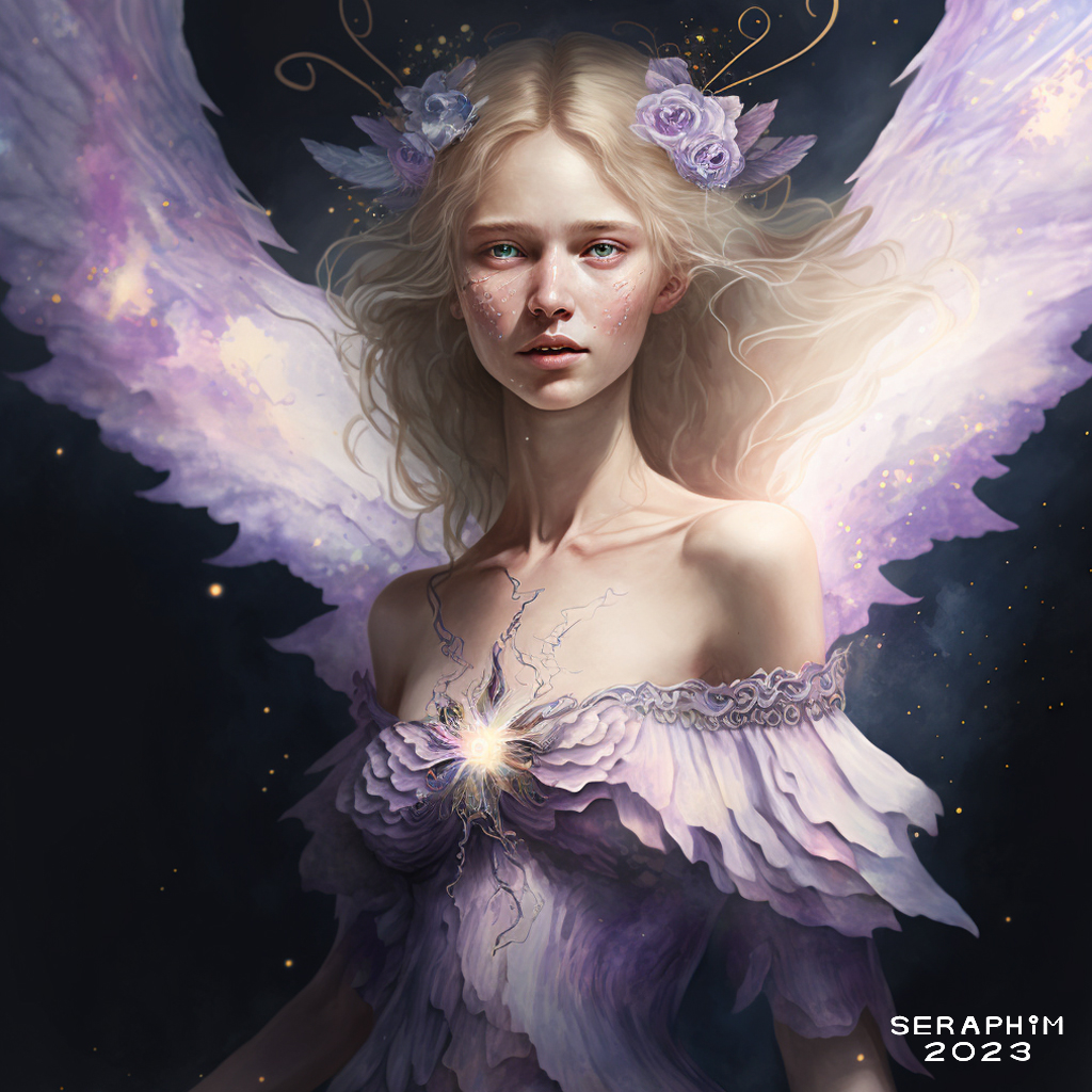 … and I loved the fact that it often put them on their heads, which led me to the explanation that Celestial Fae don’t really have ‘wings’, but cosmic energy that humans ‘see’ as wings. So, really, Midjourney prompted me with aspects of these images (: