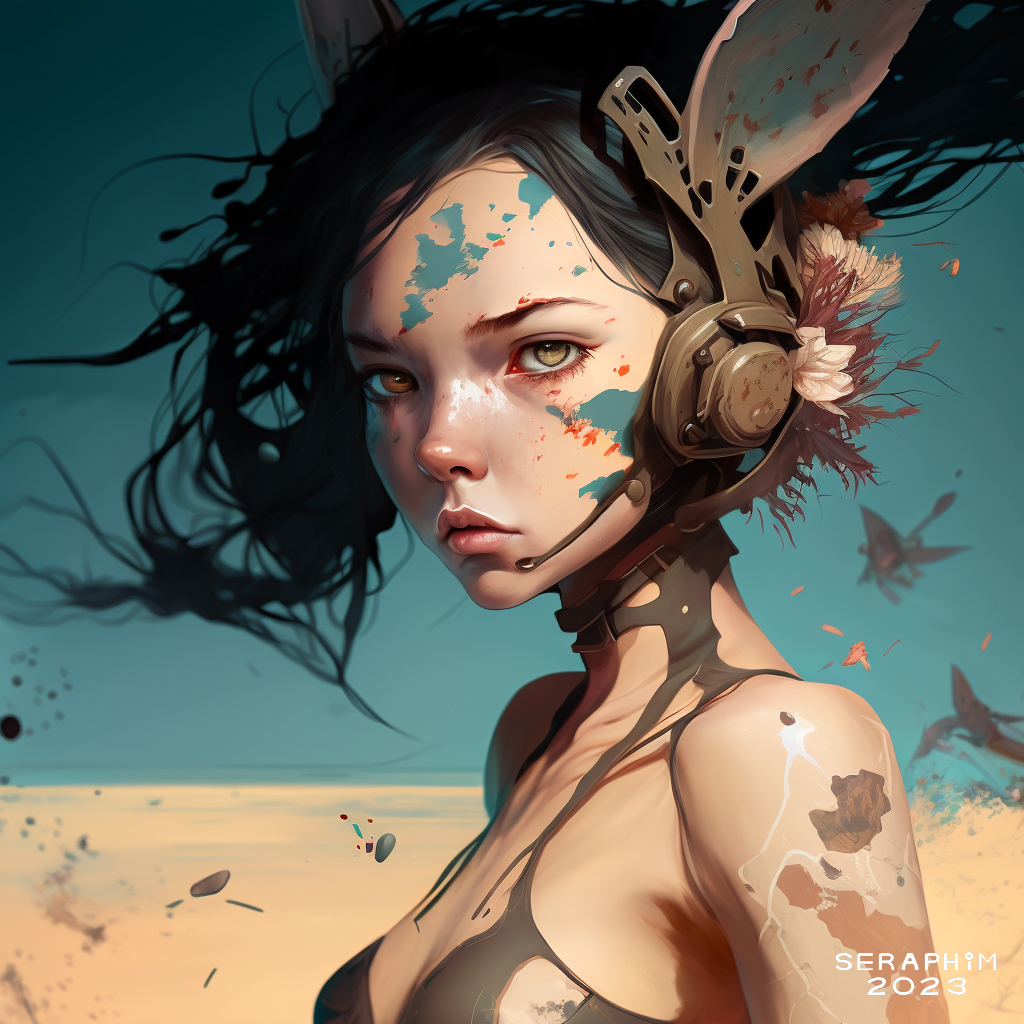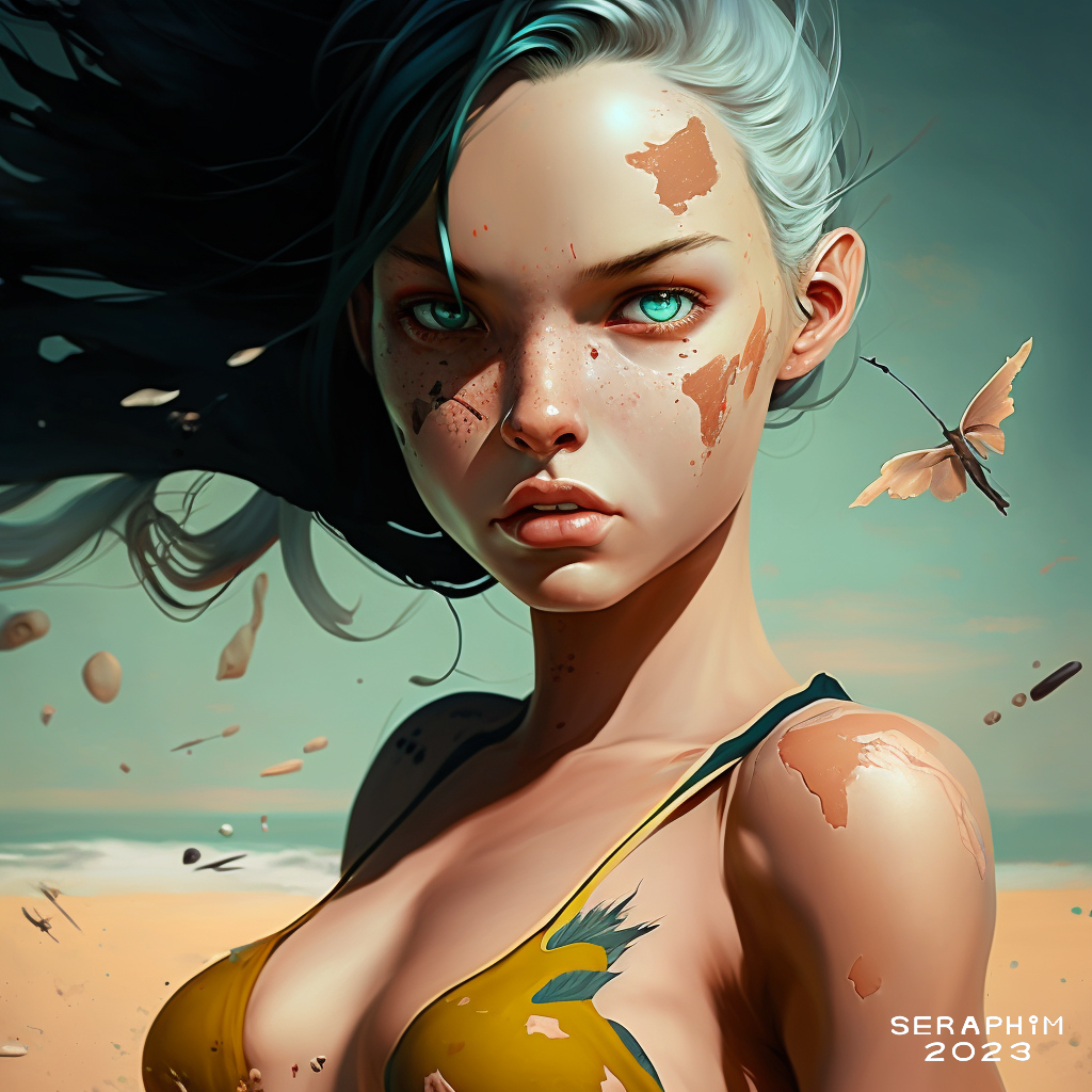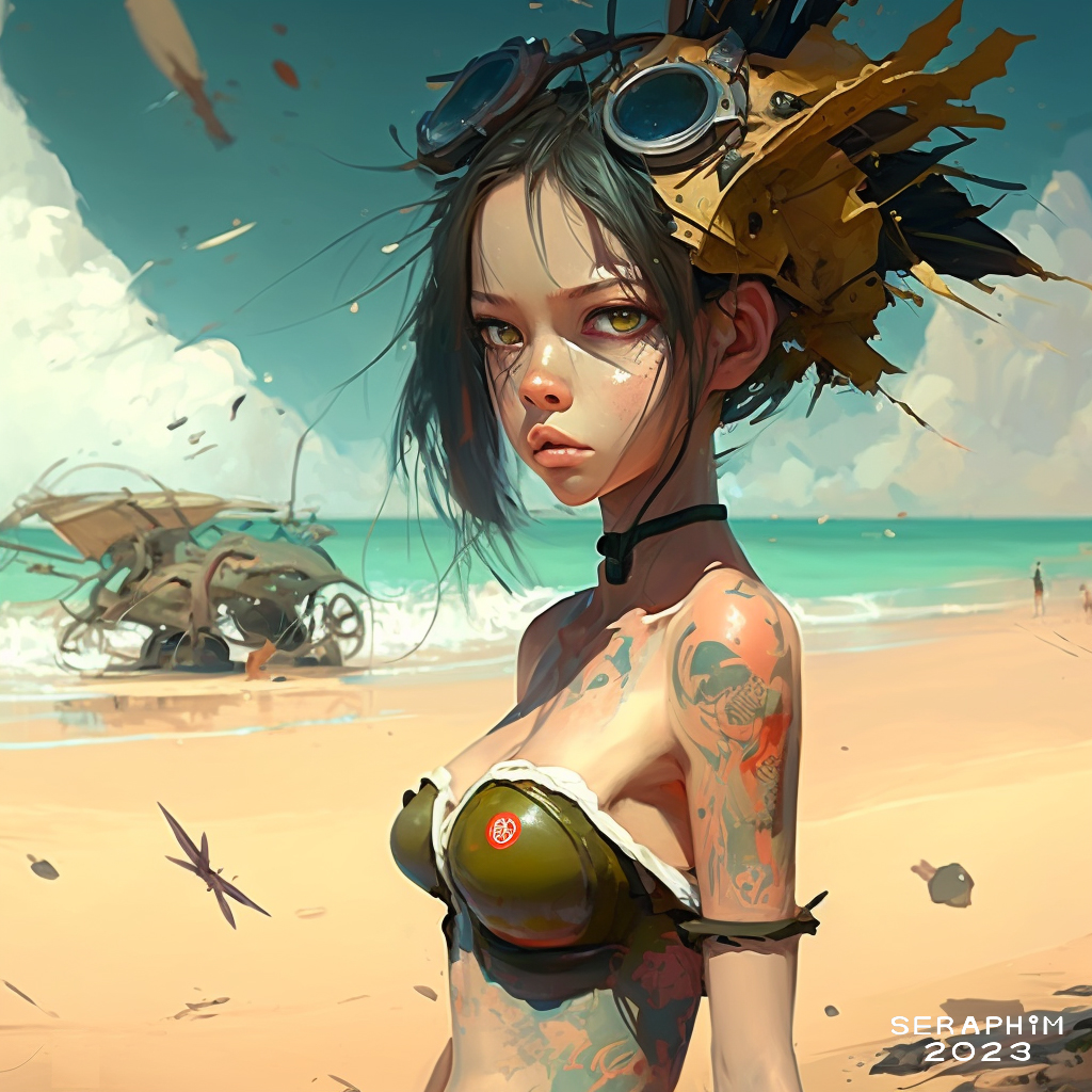 So, while experimenting with rougher-edged beauty, I took two of my images from the previous post, and combined them using the prompt ‘plastic beach bunny’… I had no thought whatsoever of creating, well, beach bunnies… rather, I just made up a phrase, like ‘fish on a bike’, to see what happened! Of course, Midjourney is extremely literal, but, still, I was delighted when it started churning out gorgeous, manga-like beach bunnies…