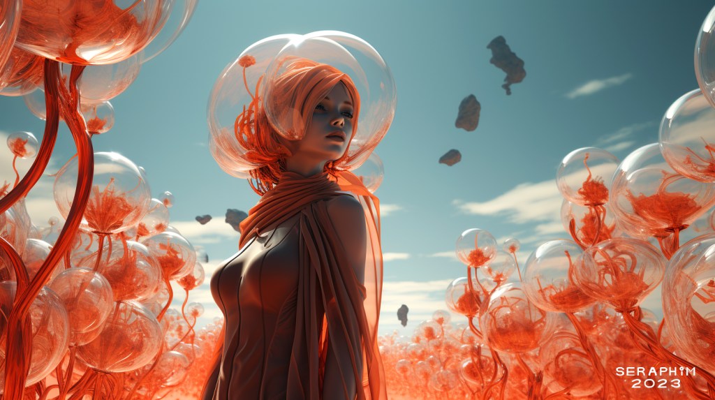 … none of these images have any prompts mentioning colour, scifi, fashion, woman, alien plants, none of that. All I do, now, is choose images from my vast store, and reiterate them. I’m pretty sure Mj is very familiar, now, with what I like, because I often see elements/themes in a new image, that are from images I produced weeks, even months ago…