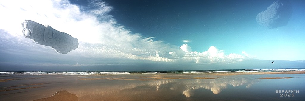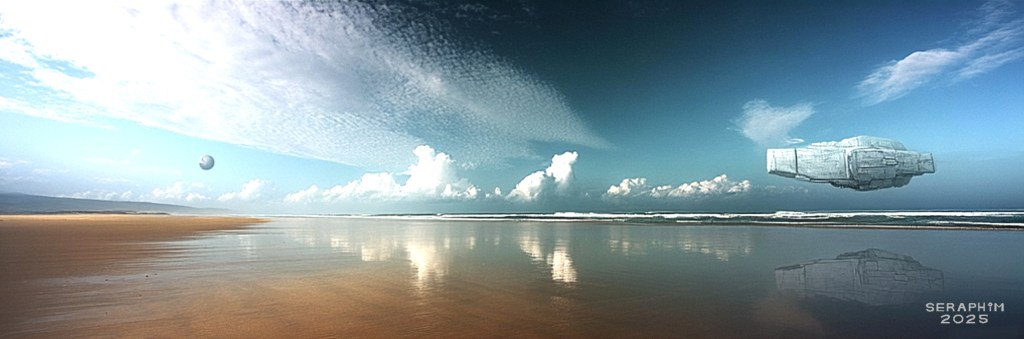 Once again, we are running way ahead of our posts, with our progress, so here’s a condensed catchup! We have found that the ‘blend’ option in MidJourney often rewards brave (seemingly incompatible) blends, with stunning, unexpected results. We got the above image (and a whole series of them) by blending one of our scifi babes from a year or so ago, with one of our recent spaceship images… we’d hoped it would put her in the foreground, ship in the background, instead it did this, which was entirely unexpected, but we can see how it came up with it, based on the two images used…