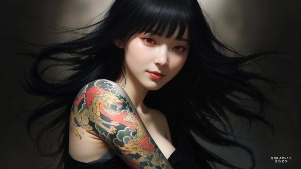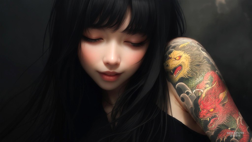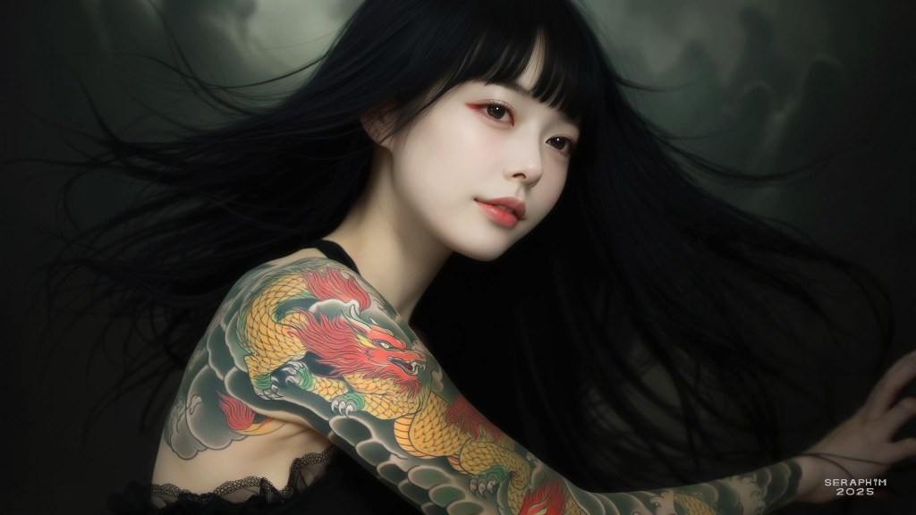 … but if you provide it with a prompt image of an actually gorgeous Asian girl, with great ink, it’s away laughing! Dream Machine has a different approach to evolving your images than Mj or Night Cafe have… if left to it’s own devices, it will vaguely change the iterations, but you can also select an image and tell it, in text, how you want to evolve that image. For instance, we originally created this image in Night Cafe, which doesn’t do very good tattoos, and the first few images had floral tattoos, so we asked it to give her ‘mythical beast’ tattoos, and we got these fabulous images…
