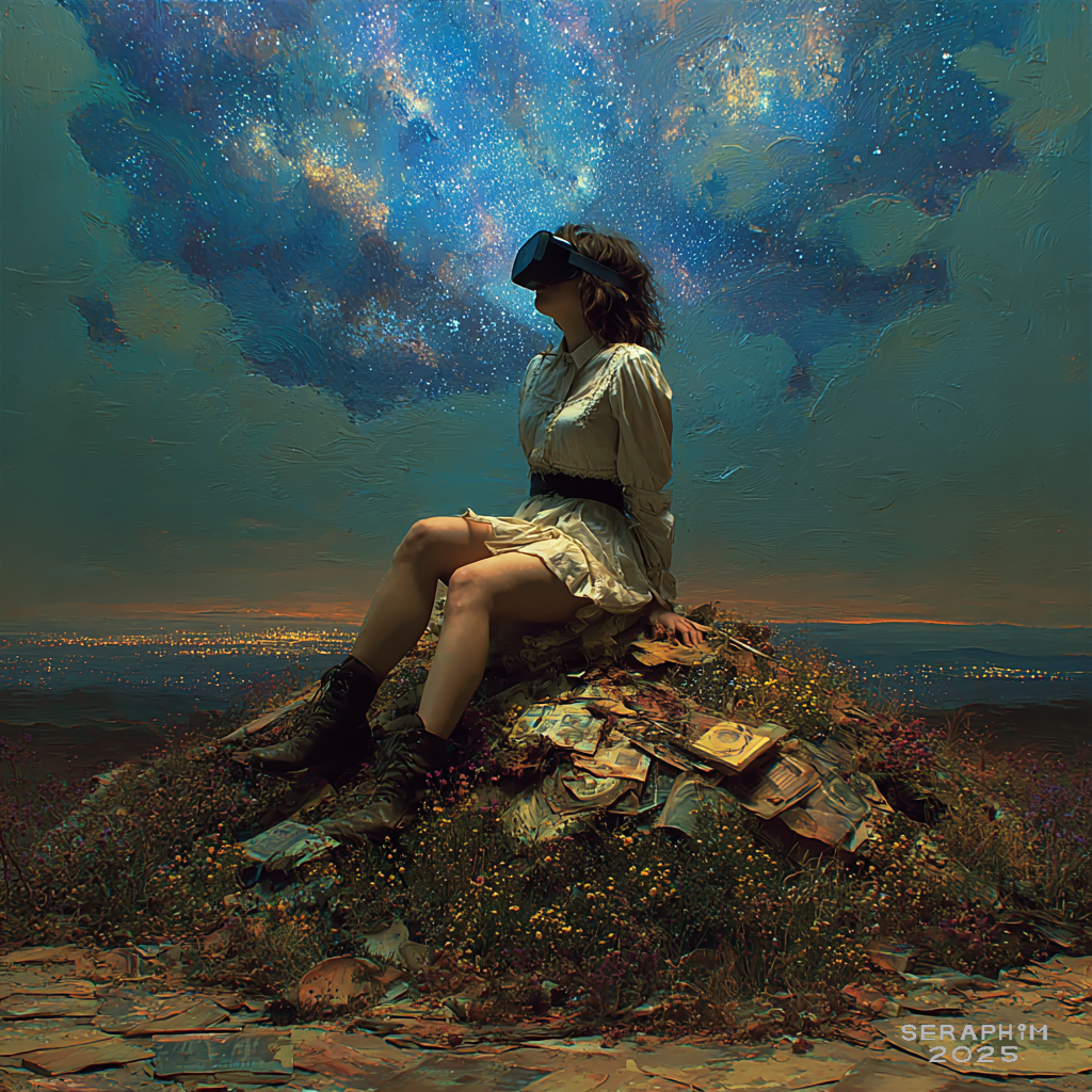 … they often have VR goggles on the figures, because that’s how Mj interprets most requests that mention ‘alternative reality’, but we don’t mind that, as what we are illustrating here is, in fact, the concept of ‘what is reality?’…