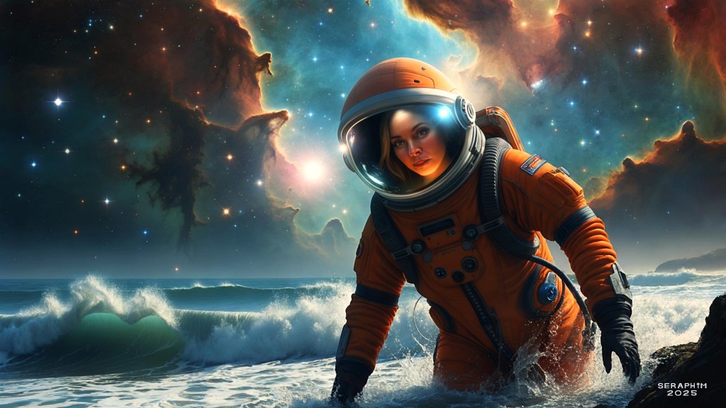 We had fun illustrating this little scenario… we couldn’t quite get her face consistent, and couldn’t get her spacesuit consistent at all, other than it being orange… but the stunning sky and the sea are wonderfully consistent (: